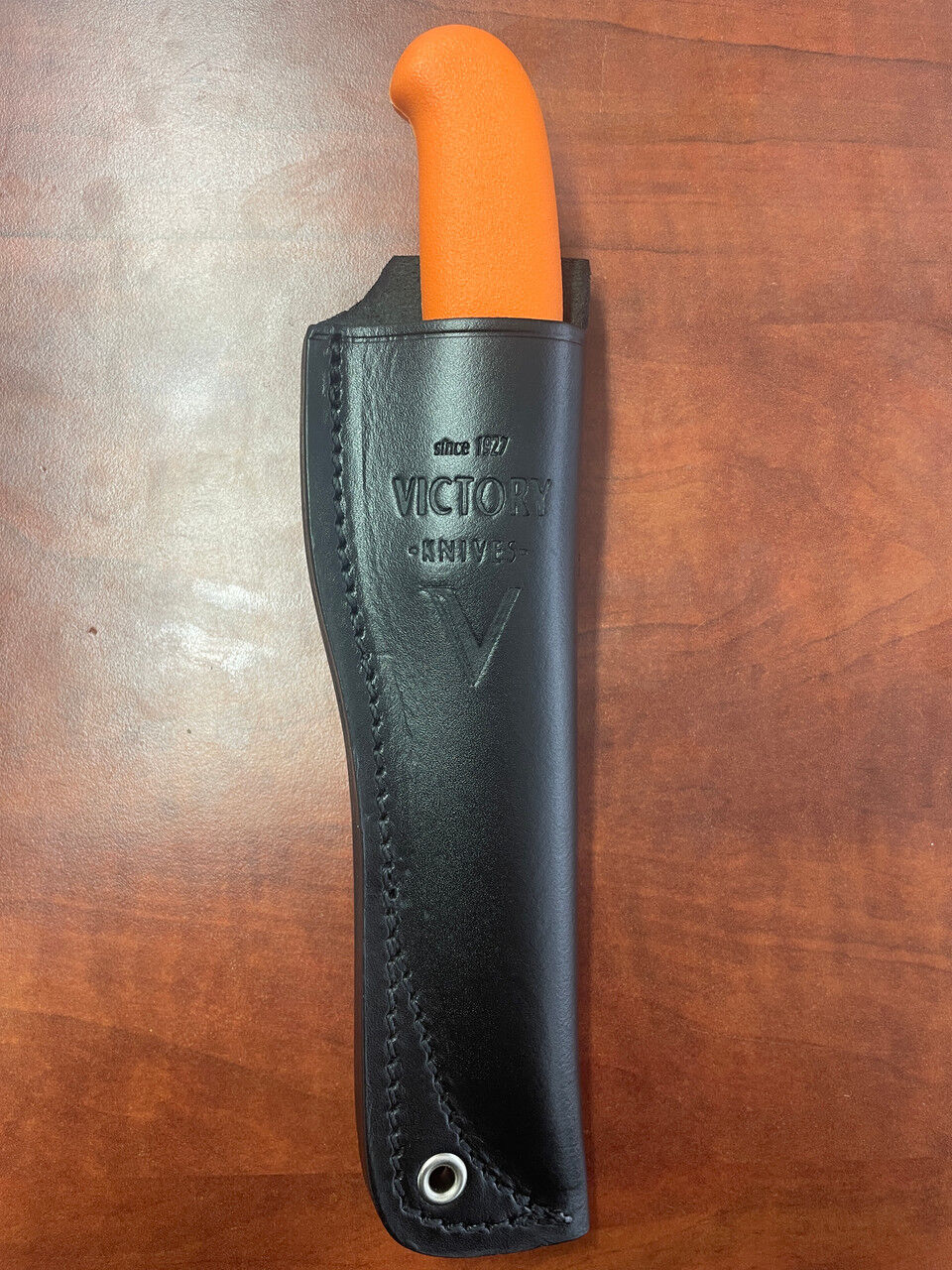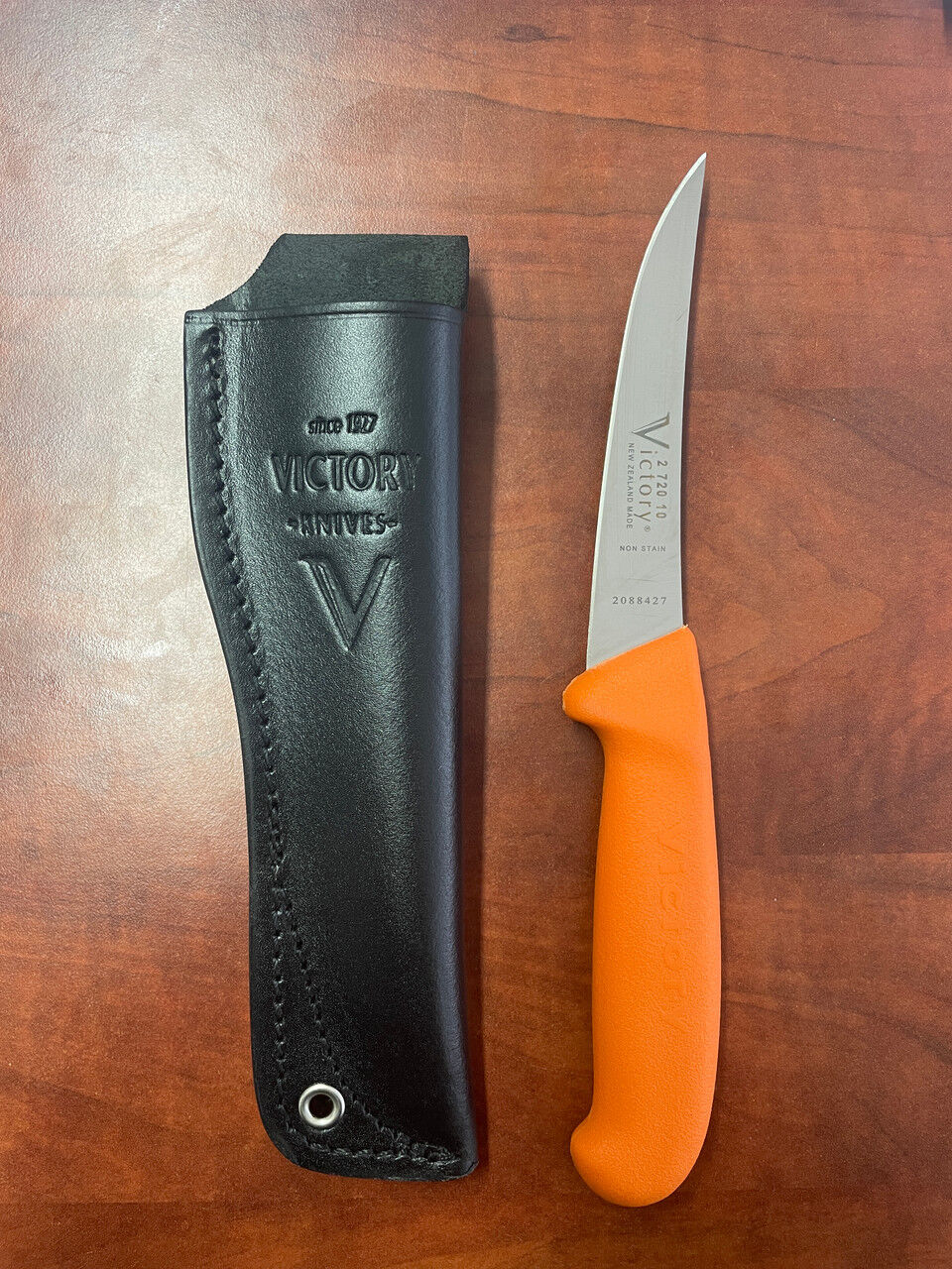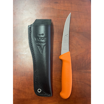 Victory Knives Light weight humters set  - 330310202SOR 2mm x 10cm Stainless Steel Drop-Point Knife (Orange Progrip Handle) with S10 Leather Sheath.